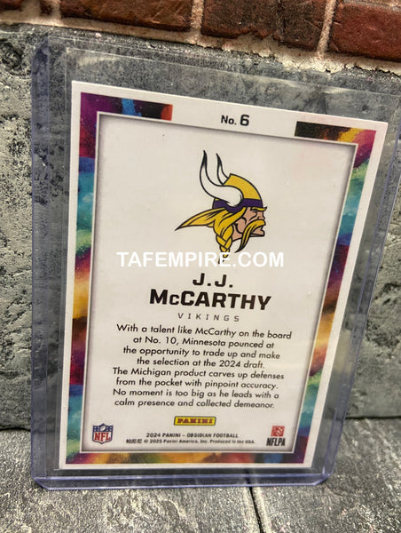 Snag this electrifying 2024 Panini Obsidian Black Color Blast rookie card of J.J. McCarthy! This stunning #6 RC features bold black design elements that make McCarthy's debut card absolutely pop. Perfect for collectors hunting rare color variants and football card enthusiasts alike. Whether you're building a McCarthy collection or chasing that elusive Color Blast parallel, this Obsidian edition delivers serious eye appeal and collectible potential. Level up your card game today!