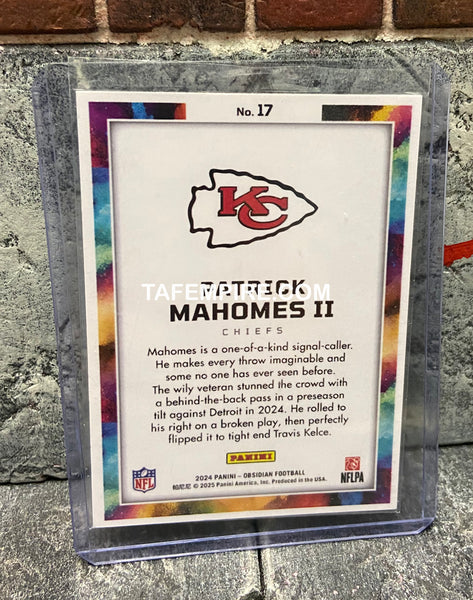 Score big with this 2024 Panini Obsidian Black Color Blast Patrick Mahomes II SSP card! Featuring the Kansas City Chiefs superstar in stunning black chrome with vibrant color blast technology, this short-printed parallel is a must-have for collectors and Mahomes fans alike. The sleek obsidian design makes this card pop off the shelf, capturing one of football's most electrifying players in premium style. Whether you're building a Mahomes collection or hunting for rare parallels, this beauty delivers serious swagger and collectible value.