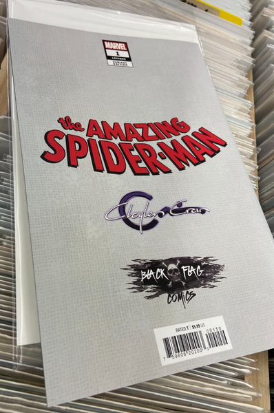 The product is an Amazing Spider-Man comic book #1 featuring artwork by Clayton Crain with a black flag virgin cover. Published by Marvel Comics in 2022, this single issue falls under the Modern Age era of US Comics. Starring Spider-Man (Peter Parker) as part of the Avengers superhero team, this variant cover adds to the collectibility of the comic for fans and collectors alike.