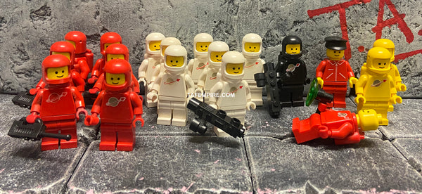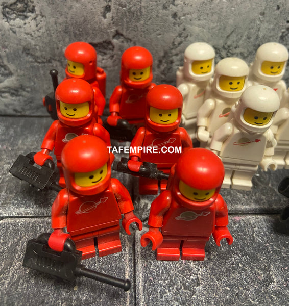 vintage lot of 18 minifigs some extra accessories 1 red astronaut is missing a helmet all have jetpacks also tossing in a bag of vintage Lego pieces see pics